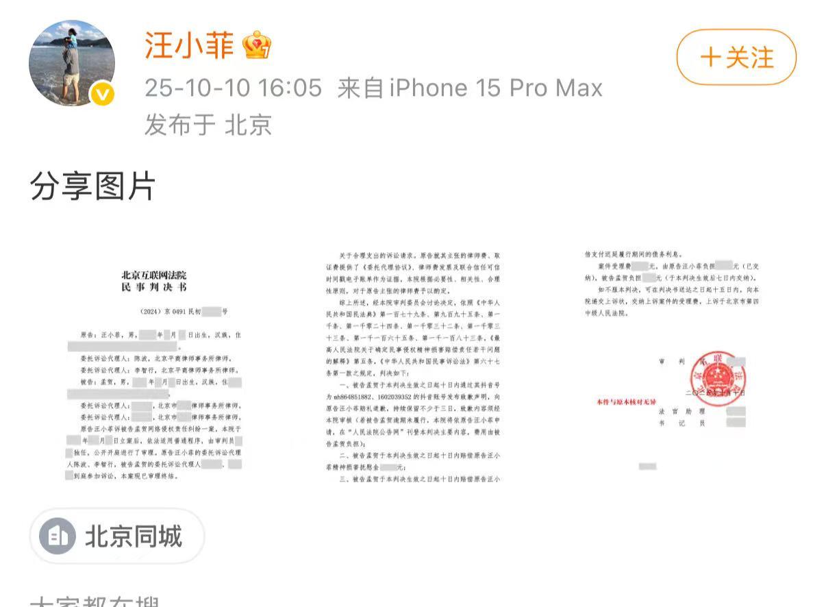 此前10月10日,汪小菲晒出北京互联网法院判决书:孟贺因在网络发表侵害汪小菲名誉权及隐私权的言论,被判公开道歉并支付精神损害抚慰金5000元。
