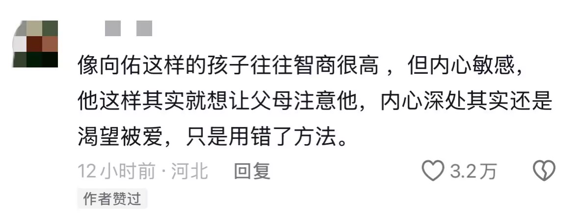 有网友分析,向佑其实是一个高智商、高敏感内心的孩子,他的所作所为其实都是为了得到父母的注意,“内心深处其实还是渴望被爱,只是用错了方法。”还有网友建议,让向佑去山区支教,教小朋友画画,或许能让他走出心灵困境。