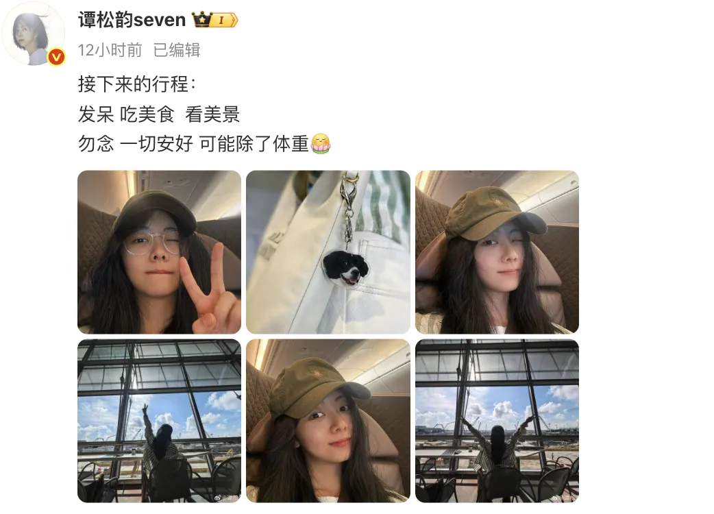 14日,谭松韵在个人社交平台回应:“勿念,一切安好,可能除了体重”,并分享接下来的计划是“发呆、吃美食、看美景”。