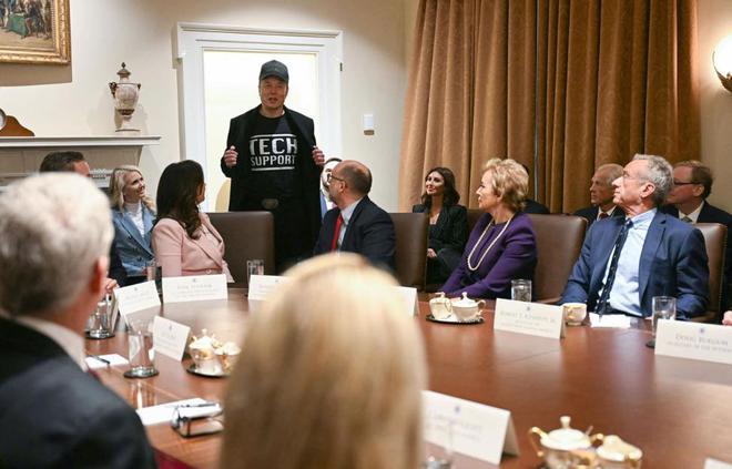 马斯克穿着标志性的“技术支持”T恤,对官员们表示自己只是一个“技术支持人员”,而“政府效率部”的工作之一就是修复美国政府年久失修的计算机系统,以及解决巨额政府赤字和债务问题。