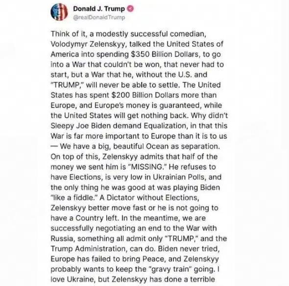 特朗普周三在社交媒体上以激烈的言辞攻击了泽连斯基,他称其是“未经选举的独裁者”,还警告说,泽连斯基必须迅速采取行动以确保和平,否则将面临“失去国家”的风险。