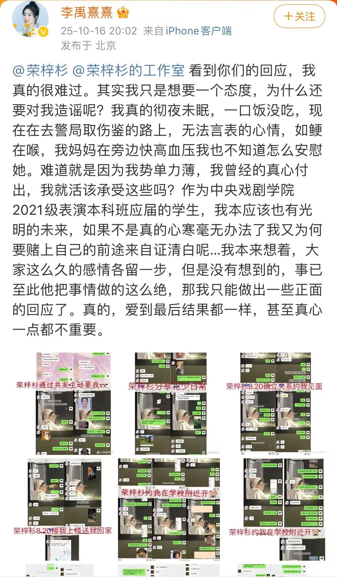 10月15日深夜,认证信息为“2022北京冬奥会演员”、多条消息显示今年刚从中央戏剧学院毕业的李禹熹发长文表示,自己于2024年8月与童星、同校师弟荣梓杉确立恋爱关系,但3个月后便遭遇对方不接电话、频繁失联的冷暴力。