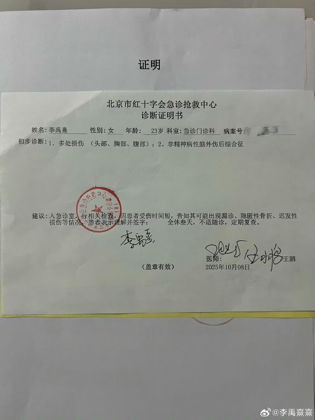 李禹熹随后在微博出示立案告知书以及诊断书,诊断书显示,其身体受到多处损伤。
