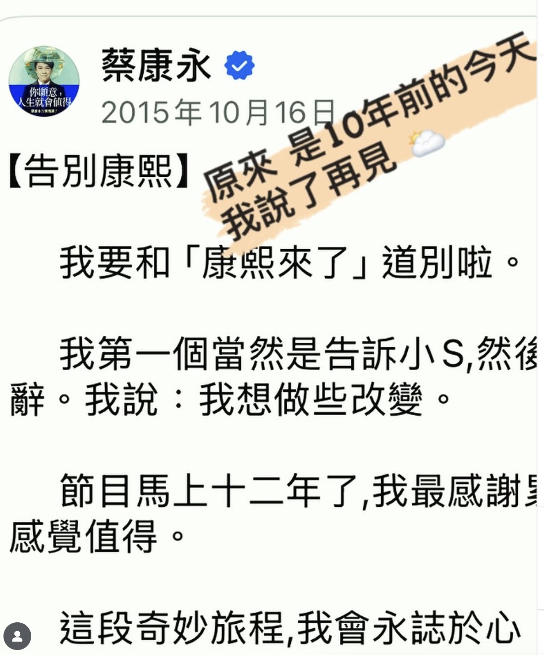 到2025年,《康熙来了》停播十年。10月16日,蔡康永在个人社交平台发出十年前的请辞声明截图,配文“原来,是十年前的今天,我说了再见”,并标记了小S的账号。