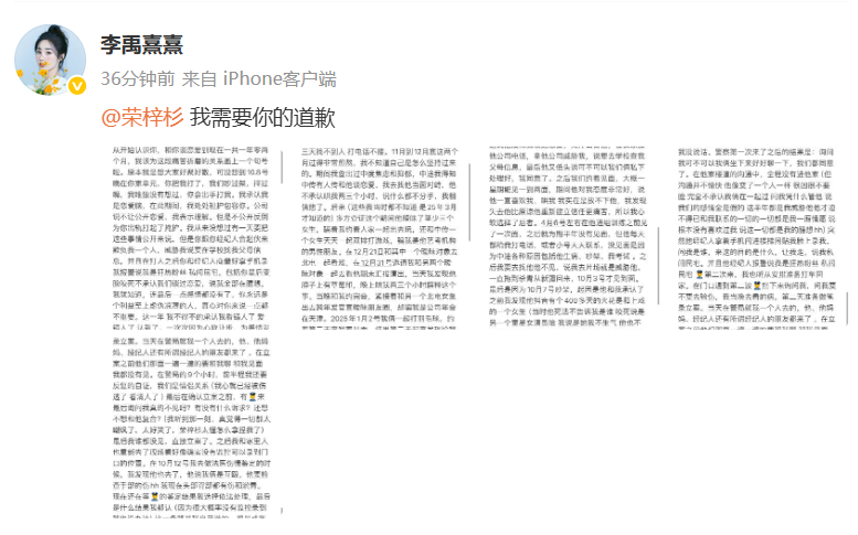 工作室在声明中列举了多项具体行为,包括言语骚扰、恶意造谣、精神施压等,称李禹熹曾通过电话、短信及社交媒体多次干扰荣梓杉及其工作,甚至以伪造言论和虚假材料进行施压。