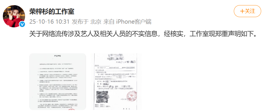 此前,10月16日,演员荣梓杉工作室发布声明,针对网络流传的涉及荣梓杉与演员李禹熹的相关不实信息作出回应。声明指出,荣梓杉与李禹熹从未建立恋爱关系,更不存在所谓“恋爱”“出轨”等传闻,相关内容均为虚假信息。