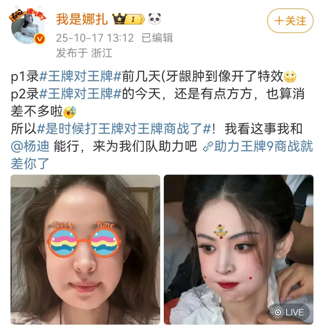 她自嘲,前几天“牙龈肿到像开了特效”,今天基本消肿,“还是有点方方的。”