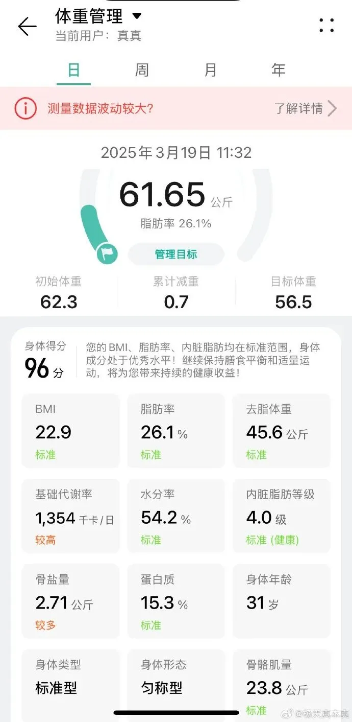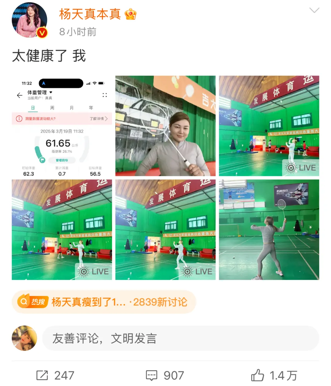 今年3月,杨天真在社交账号发布状态:“太健康了,我!”