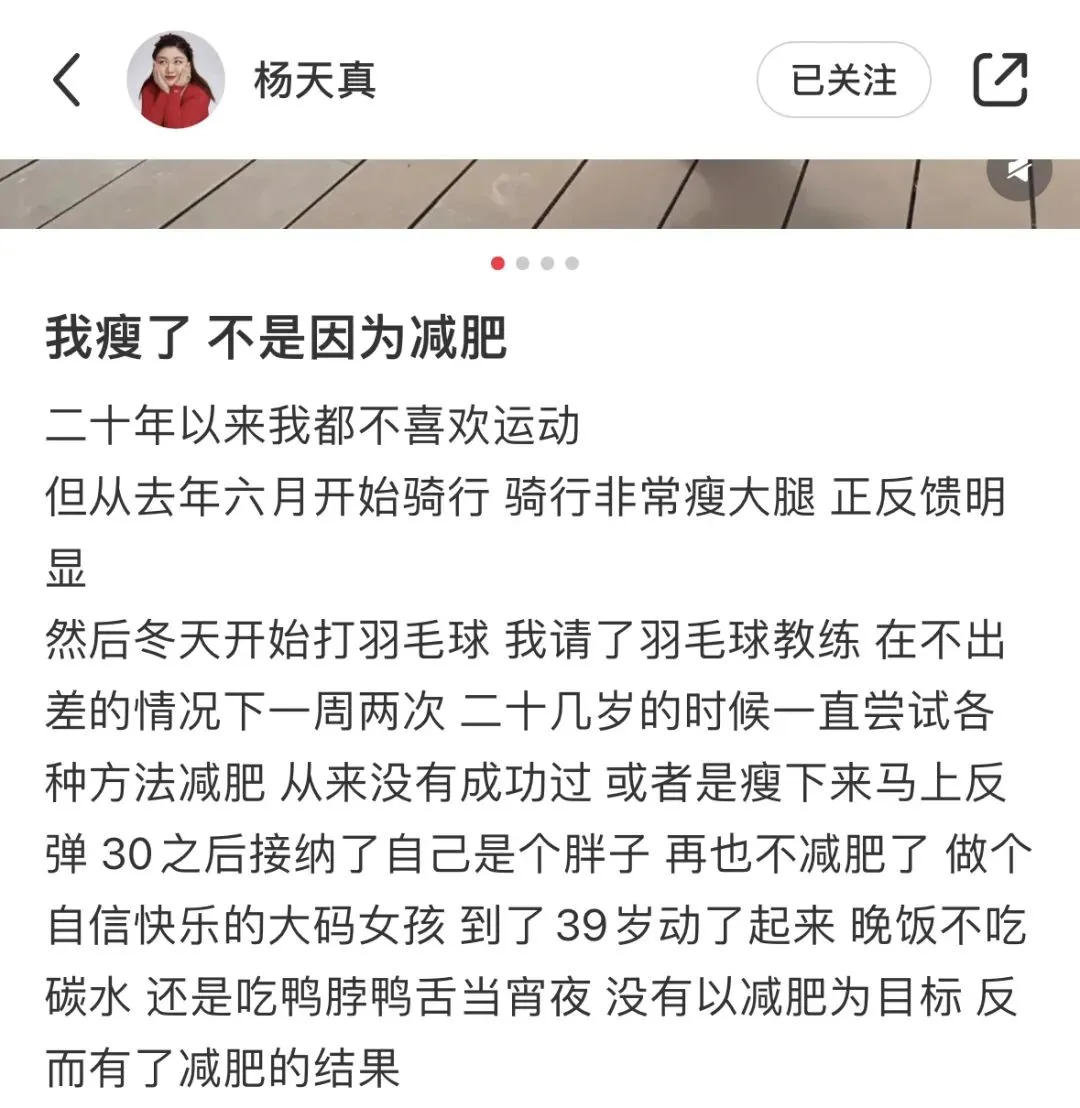 她说:自己以前尝试过很多很多的减肥方法,从来没有成功过。39岁后接受躺平,然后宵夜还吃鸭脖鸭舌。但因为有了骑行和羽毛球,反而瘦了下来。