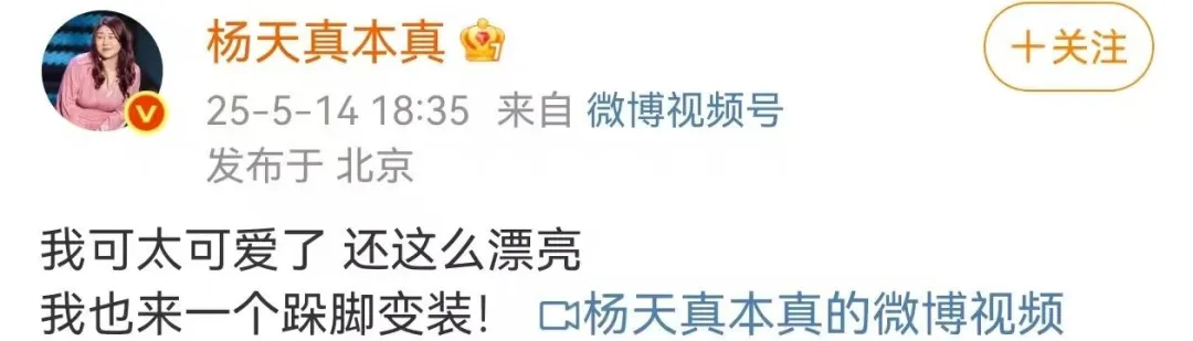 5月14晚,杨天真在个人社交平台晒出一段“跺脚变装”视频,并配文:我可太可爱了,还这么漂亮。