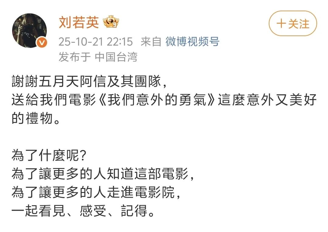 21日,阿信在社交平台发文预热新歌。刘若英也发文称,谢谢五月天阿信及其团队,送给我们电影《我们意外的勇气》这么意外又美好的礼物。