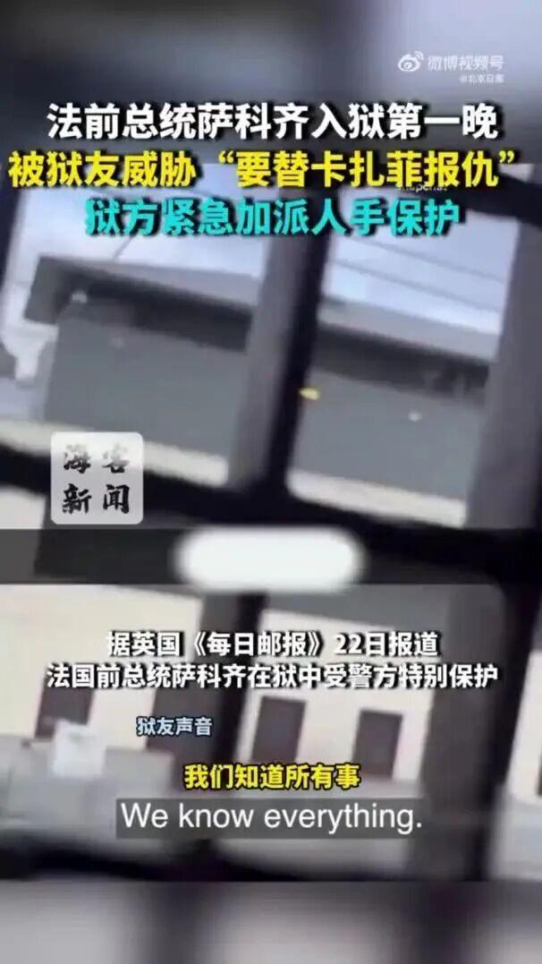 当地时间10月21日,法国前总统萨科齐前往巴黎拉桑特监狱,正式开始服刑。据海客新闻,英国《每日邮报》22日报道,萨科齐入... 当地时间10月21日,法国前总统萨科齐前往巴黎拉桑特监狱,正式开始服刑。据海客新闻,英国《每日邮报》22日报道,萨科齐入狱第一晚,被狱友威胁“要替卡扎菲报仇” ,狱方紧急加派人手保护。报道称,就在萨科齐入狱不到1个小时,网友即流传一段狱友威胁他的视频。视频中狱友高喊:“萨科齐,我们知道一切,把数十亿美元还给我们”“我们知道你关在哪里”“我们要为卡扎菲报仇”。