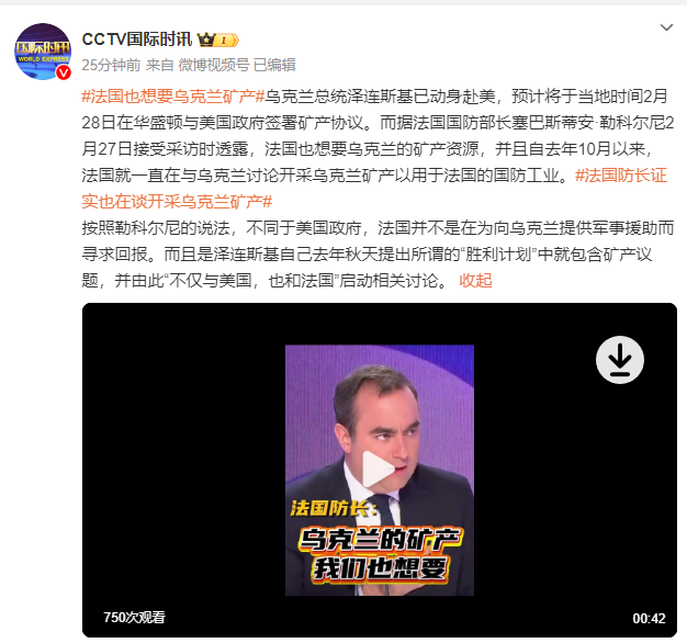 来源:CCTV国际时讯微博乌克兰总统泽连斯基已动身赴美,预计将于当地时间2月28日在华盛顿与美国政府签署矿产协议。而据... 来源:CCTV国际时讯微博