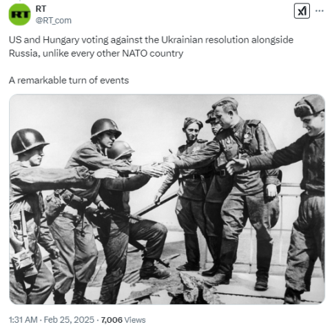 RT还为这则帖子配了一张“美苏易北河会师”的历史照片。1945年4月25日,分别在东西两线对纳粹德国作战的美国和苏联军队,当天在德国易北河畔的托尔高进行会师,该照片是美苏合作以及法西斯阵营濒临崩溃的重要象征之一。