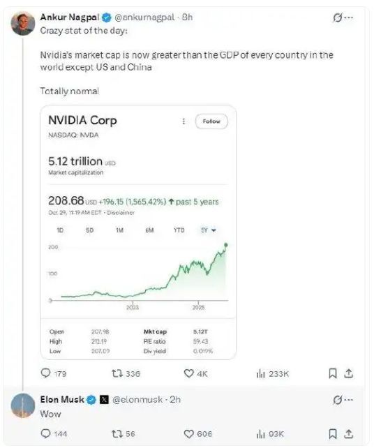 一位网友在社交平台X上转发了英伟达市值一度突破5.1万亿美元的截图,特斯拉CEO埃隆·马斯克也不尽发出赞叹之声。