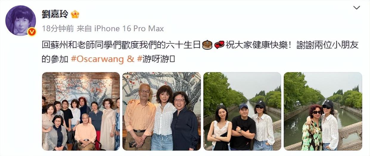 据此前报道:5月19日中午,刘嘉玲晒了与老师、同学的合影。配文:苏州和老师同学们欢度我们的六十生日,祝大家健康快乐!