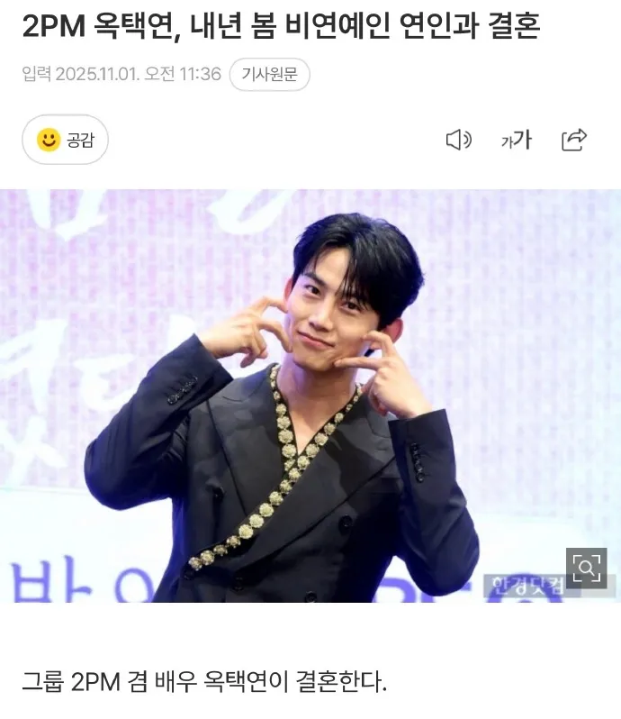 韩国男演员、2PM成员玉泽演官宣结婚,配偶是素人,婚礼于明年举行;曾与鬼鬼吴映洁“组CP”参加综艺《我们结婚了》