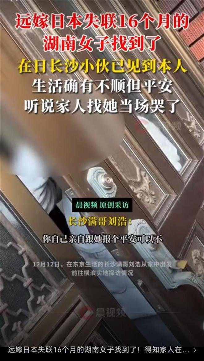12月12日,在东京生活的“长沙满哥”刘浩从家中出发前往横滨实地探访,找到了向晓芳。得知家人在找自己,女子当场落泪,并表示:生活确有不顺但平安。