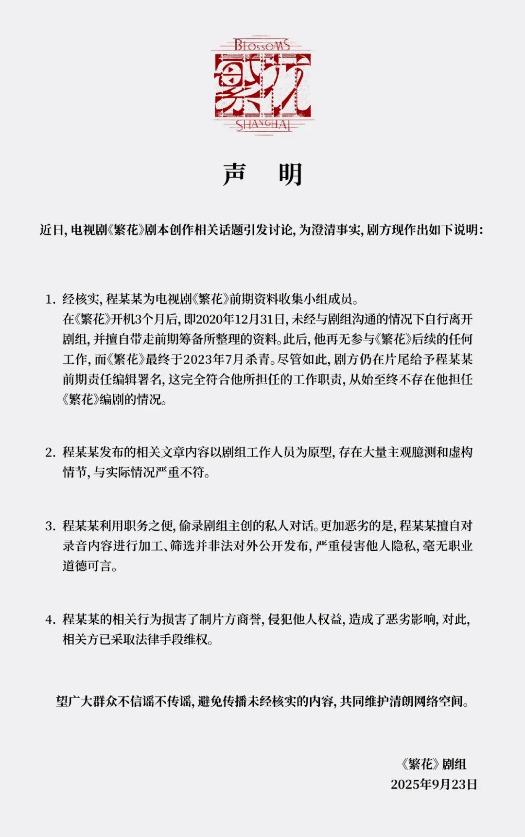 9月23日,《繁花》剧组再次发布声明,回应近期的编剧署名争议。