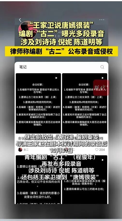 据热度新闻消息,10月31日,编剧古二再曝王家卫秦雯录音,引发对倪妮“后台”、“靠山”等猜测。