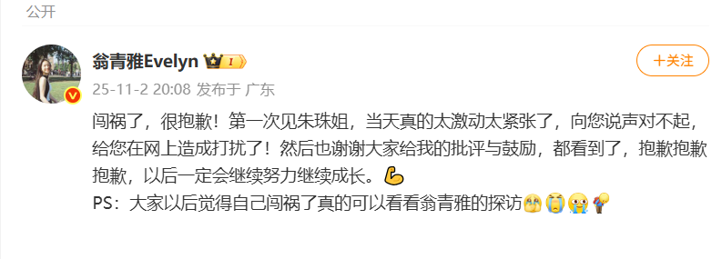 闯祸了,很抱歉!第一次见朱珠姐,当天真的太激动太紧张了,向您说声对不起,给您在网上造成打扰了!然后也谢谢大家给我的批评与鼓励,都看到了,抱歉抱歉抱歉,以后一定会继续努力继续成长。