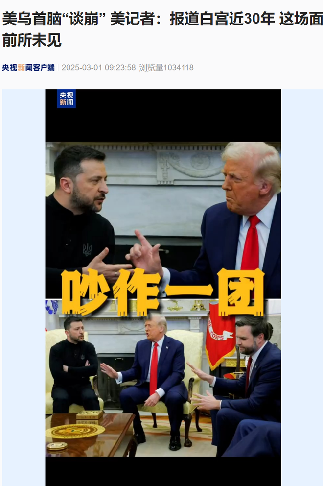 据央视新闻3月1日消息,当地时间2月28日,白宫椭圆形办公室内,美国总统特朗普与到访的乌克兰总统泽连斯基在媒体面前发生激... 据央视新闻3月1日消息,当地时间2月28日,白宫椭圆形办公室内,美国总统特朗普与到访的乌克兰总统泽连斯基在媒体面前发生激烈争吵,场面一度失控。美国副总统万斯也卷入其中,双方你来我往,各执一词。《纽约时报》驻白宫首席记者皮特·贝克表示,自1996年报道白宫新闻以来,这是他首次见到如此场面。