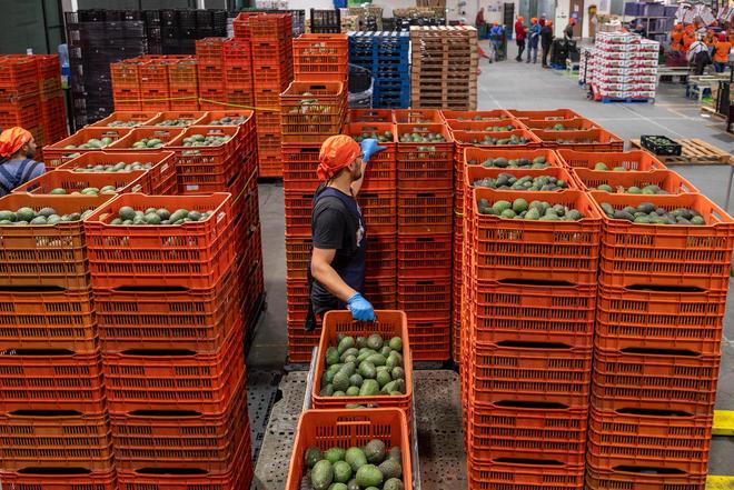 当地时间3月18日,在墨西哥米却肯州乌鲁阿潘,一名工人在牛油果包装厂搬运待分类的牛油果箱子(图据视觉中国)