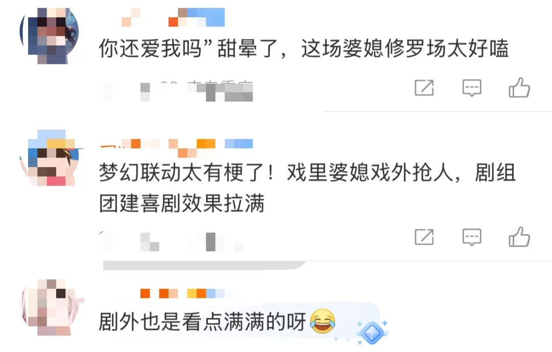 这波跨剧联动逗笑全场,不少网友留言表示:随时随地演小品,戏称“这场婆媳修罗场”的名场面。