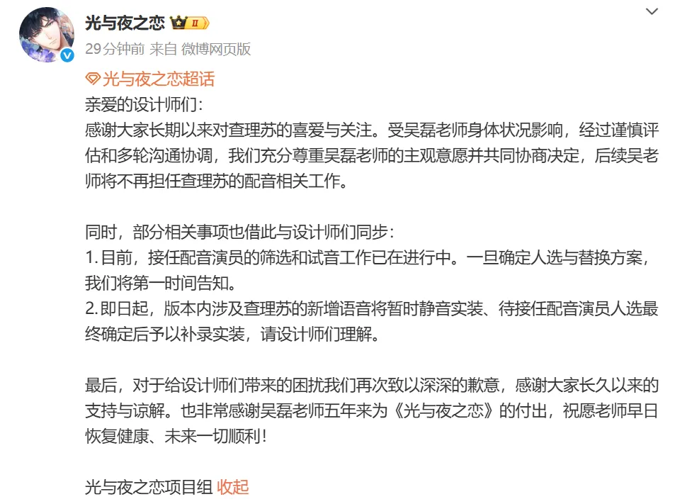 随后,@光与夜之恋也发文确认了该消息,称接任配音演员的筛选和试音工作已在进行中。