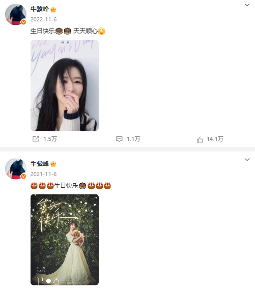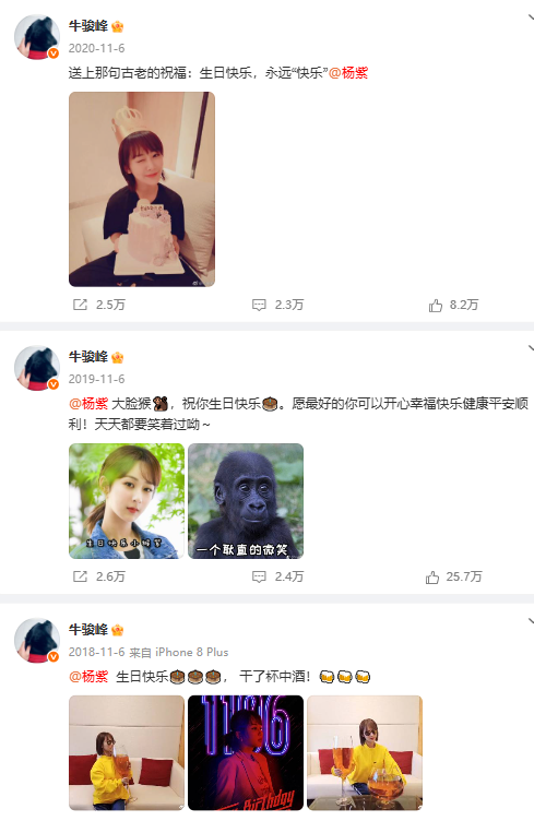 此前,牛骏峰多次为好朋友杨紫庆生。