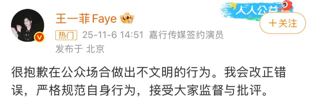随后,王一菲微博发文道歉:“很抱歉在公众场合做出不文明的行为。我会改正错误,严格规范自身行为,接受大家监督与批评。”