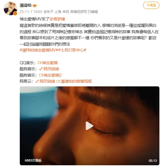 11月7日早上,潘玮柏发布悼念爱情MV并@蒋梦婕:写这首歌的时候,其实是把爱情当作即将离开的人。感情的消逝是一种从灿烂到黑白的过程,所以想到了用消除记忆来悼念。其实拍这个记忆消除的故事,我身边每个人在看到故事脚本和成片之后的感觉都不一样,你们看到的又是什么样的故事呢?欢迎一起讨论,让我听听你们的想法~