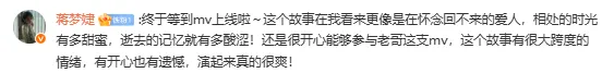 随后,蒋梦婕在下放评论:终于等到mv上线啦~这个故事在我看来更像是在怀念回不来的爱人,相处的时光有多甜蜜,逝去的记忆就有多酸涩!还是很开心能够参与老哥这支mv,这个故事有很大跨度的情绪,有开心也有遗憾,演起来真的很爽!