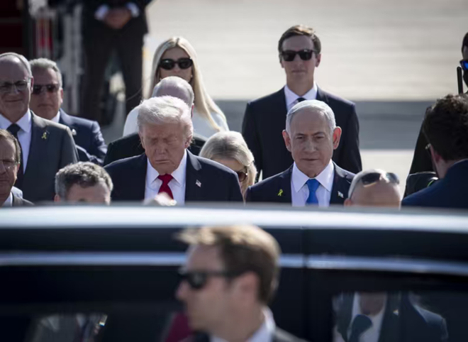 特朗普(图中左一)前往以色列,之后前往埃及沙姆沙依赫主持“和平峰会” 图:新华社