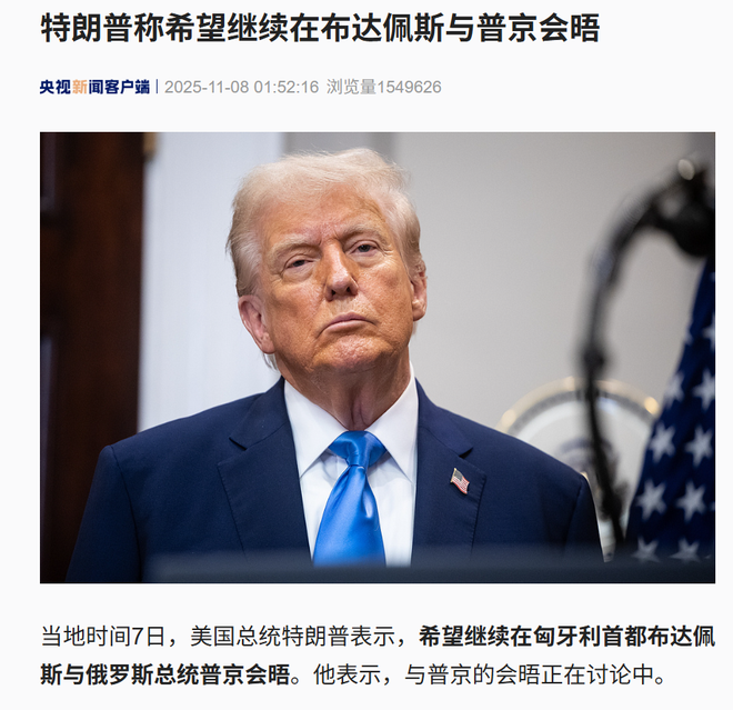 据央视新闻报道,当地时间11月7日,美国总统特朗普表示,希望继续在匈牙利首都布达佩斯与俄罗斯总统普京会晤。他表示,与普京的会晤正在讨论中。