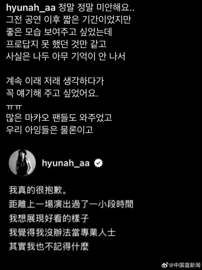歌手泫雅向粉丝致歉并报平安,称自己不记得什么;此前在音乐节表演时突然晕倒在台上