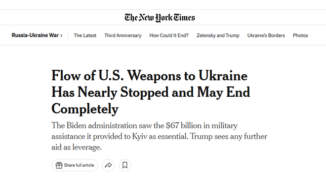 美国《纽约时报》2月28日称,特朗普政府官员当天表示,美国对乌克兰的所有援助——包括拜登政府期间授权和批准提供的最后一批弹药和设备——可能很快就会被取消。