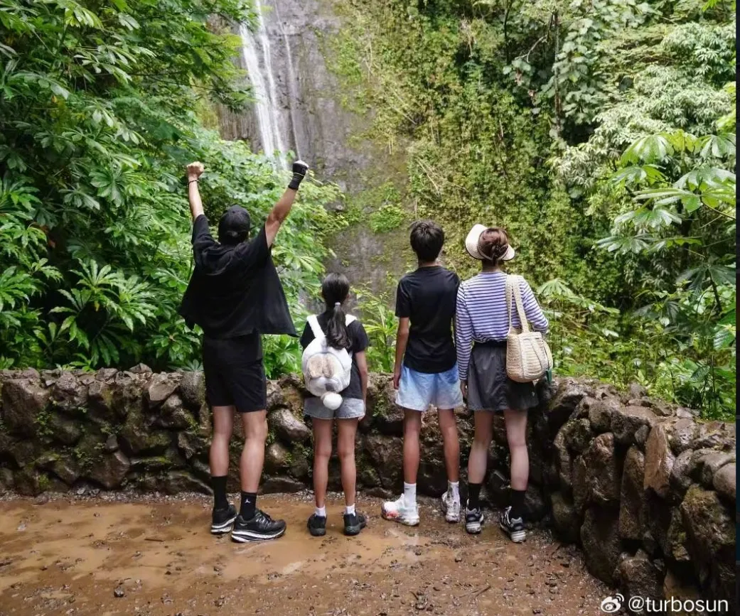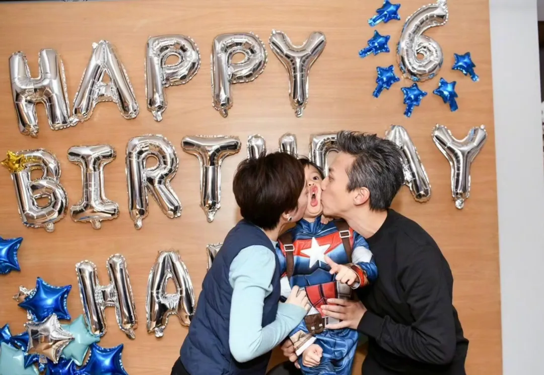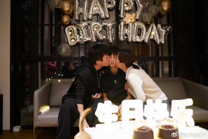 照片中,孙俪和邓超一人一边,亲吻儿子的脸颊,复刻了多年前的姿势。