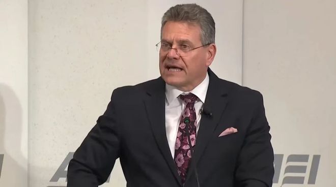 当地时间2月19日,欧盟贸易专员马罗什·谢夫乔维奇在美国华盛顿讲话