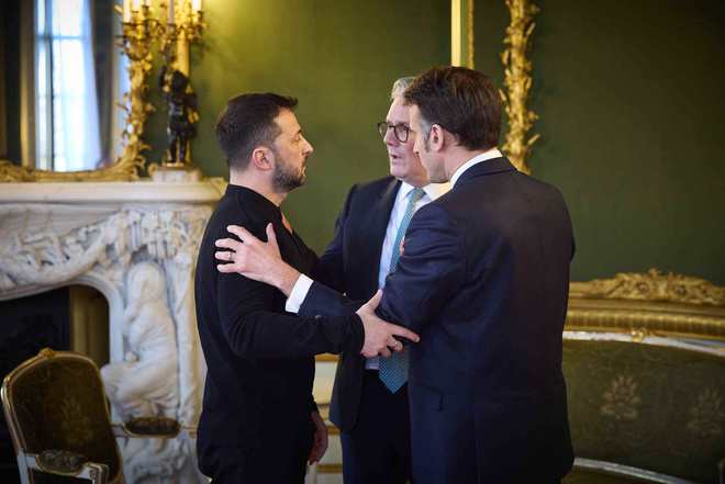 3月2日,泽连斯基、斯塔默(中)和法国总统马克龙(右)在英国伦敦举行领导人峰会(图据视觉中国)