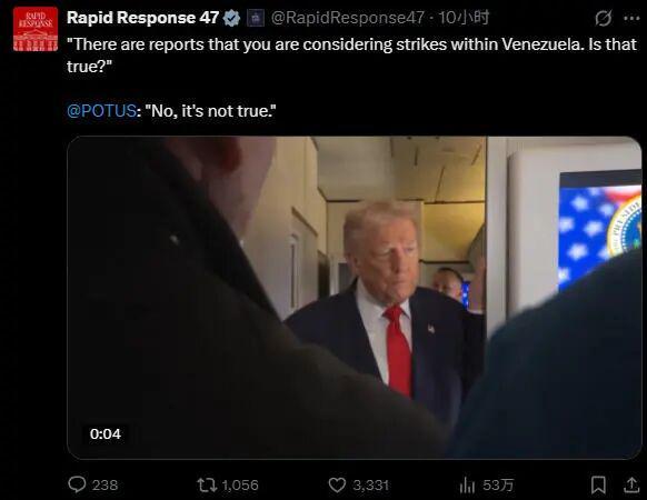 据白宫消息,当地时间31日,有记者询问美国总统特朗普:“有报道称,你们正在考虑对委内瑞拉境内发动袭击。这是真的吗?”特朗普回答说:“不是,这不是真的。”