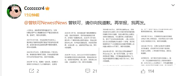 11月17日,前工作人员再发文称“再举报,我再发”,控诉曾轶可,在我跟你共事和合作期间,你多次情绪失控,在公开场合言语羞辱、人身攻击、威胁等系列职场霸凌行为,对我的职业尊严与心理健康造成了严重且持续的伤害。曾轶可,请你向我道歉。
