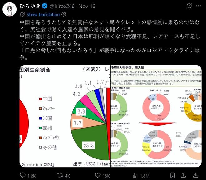 他写道:“一旦中国停止对日出口,日本将面临化肥短缺,然后就会出现粮食供应不足;同时稀土也会出现匮乏,从而令高科技产业陷入停滞。”他还贴出了两张图表,展现了日本在多个经济领域和中国的联系。
