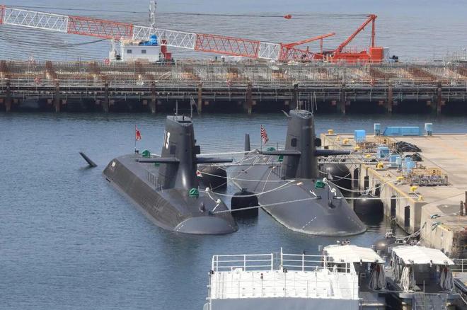 日本海上自卫队的“大鲸”号潜艇(左)和“亲潮型”潜艇(右)。2022年4月,于神奈川县横须贺市的美国海军横须贺基地