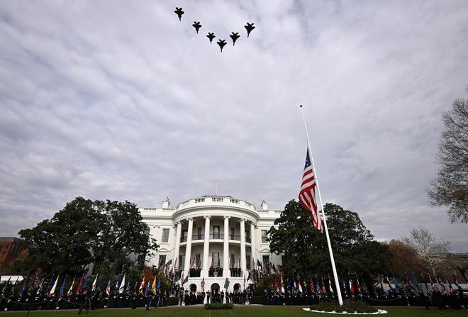 特朗普在白宫欢迎穆罕默德时,军机编队飞越上空
