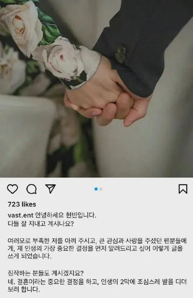 玄彬:“我决定结婚,小心翼翼地踏入人生的第二幕,我和总是笑的她约定好了,以后的日子一起走下去。在作品中一起合作过的政赫和世莉要一起迈出一步。”