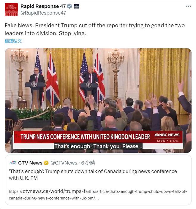 特朗普官方快速反应账号“RapidResponse47”转发了CTV的推文,驳斥其为“假新闻”,“特朗普总统打断了试图引发两国领导人分歧的记者,停止撒谎吧。”