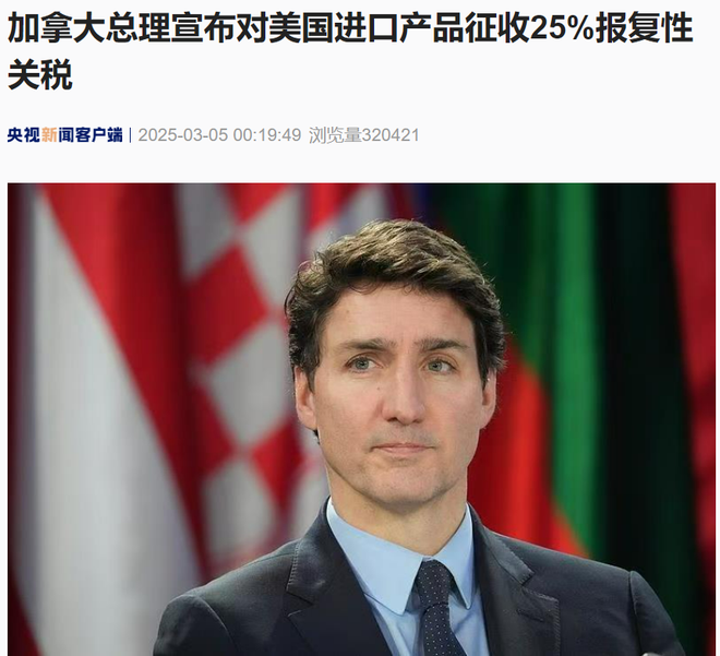 据央视新闻3月5日消息,当地时间3月4日,加拿大总理特鲁多宣布,对从美国进口的产品征收25%的报复性关税。央视新闻报道截... 据央视新闻3月5日消息,当地时间3月4日,加拿大总理特鲁多宣布,对从美国进口的产品征收25%的报复性关税。