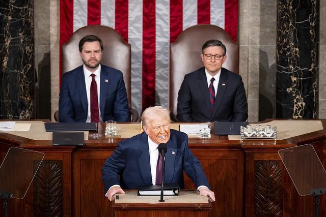当地时间3月4日,特朗普在美国国会大厦向国会联席会议发表讲话,副总统万斯(左)和众议院议长迈克·约翰逊在其身后 图/视觉中国