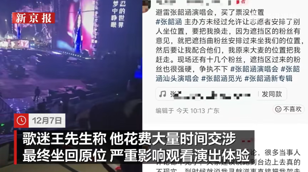12月6日,多名歌迷称在汕头参加张韶涵演唱会时,因入场较晚,发现座位被安排给坐在遮挡区的观众坐。12月7日,歌迷王先生称... 12月6日,多名歌迷称在汕头参加张韶涵演唱会时,因入场较晚,发现座位被安排给坐在遮挡区的观众坐。12月7日,歌迷王先生称,他花费大量时间交涉才坐回原位,严重影响观看演出体验。